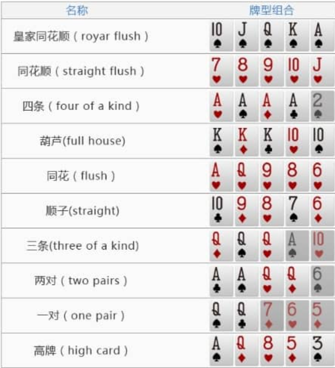 • 在德州扑克中,每位玩家最终都要从两张手牌 + 五张公共牌中,选出最好的五张组合牌来比较胜负。