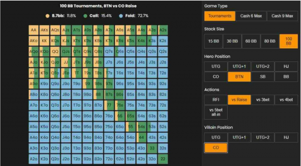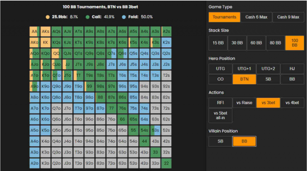 除了跟注防守,大盲也要 提高3-bet反击频率至约 16%——远高于普通玩家常见的 5%–8%。