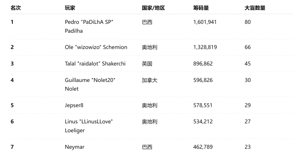 周一深夜,Alexandros “pwndidi” Theologis 在第八名止步,成为泡沫玩家,其余选手则全部锁定至少 26,111 美元的奖金。内马尔虽然在比赛中投入了两次买入,但如今已经确保盈利,Padilha 与 Shakerchi 亦是如此。