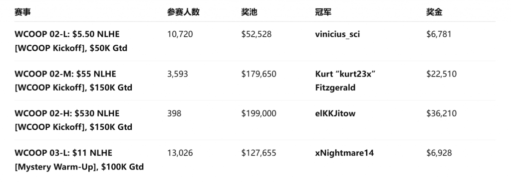 巴西玩家 “vinicius_sci” 在 $5.50 Kickoff 赛事中夺得系列赛首冠,拿下 $6,781。在高额赛部分,Leon “RUMUKULUS” Sturm 则赢下 $5,200 Bounty Builder Super High Roller,斩获目前本届 WCOOP 最大单笔奖金 $109,822。